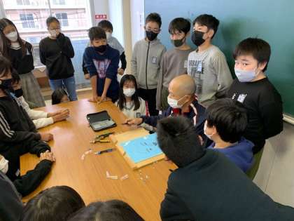12月1日(水)1時間目、6年1組は図工で版画をしていました。先生のまわりに集まり平刀や丸刀の使い方等を聞いていました。