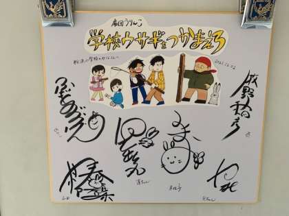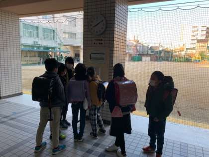 12月3日(金)朝、玄関に人だかりができていました。昨日見た劇の劇団からいただいたしき紙を見ていました。「絵の中に登場人物の山田さんがいない。」という子がいました。「その山田さんが描いた絵らしいよ。」と伝えておきました。