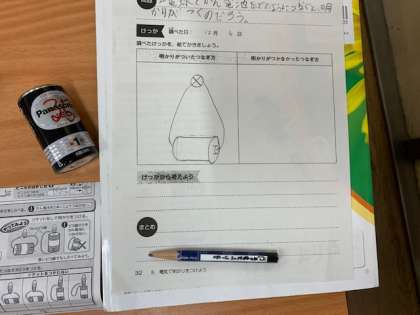 12月6日(月)5時間目、3年1組は理科で、豆電球と乾電池のつなぎ方について学習していました。予想通りにつないで豆電球がついたのでしょうか?