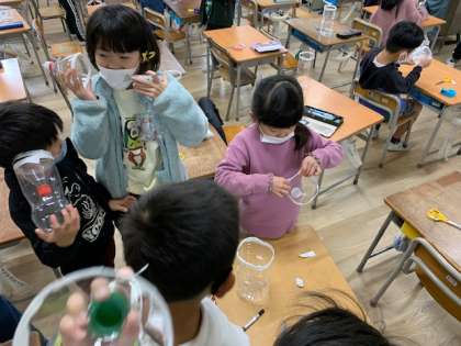 12月8日(水)1時間目、1年1組は図工で「おしゃれなパフェ」を作っていました。ペットボトルを二つに切り、切ったところにビニルテープを貼っていました。子どもたちは、ペットボトルを切ったことがうれしかったのか、パフェをつくることに胸を膨らませているのか、どの子も目の前までペットボトルを見せにきたり、頭にかぶって見せたりしてきました。