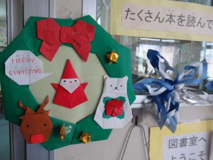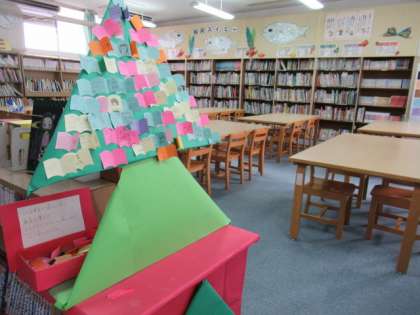 2枚目の写真は、子どもたちが図書室で読んだ本を書き、ツリーに貼って、クリスマスツリーにしています。