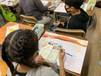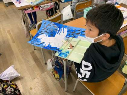 12月8日(水)5時間目、5年2組は図鯉腕「大造じいさんとがん」の絵を描いていました。細かくがんを描いている子もいれば、ダイナミックに描いている子もいました。