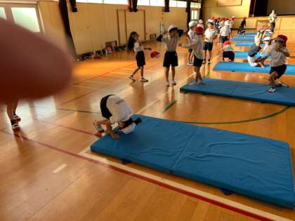 12月13日(月)3時間目、1年1組は体育でマット運動をしていました。前回りや後ろ周りをしていました。