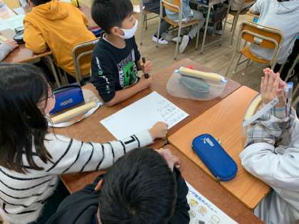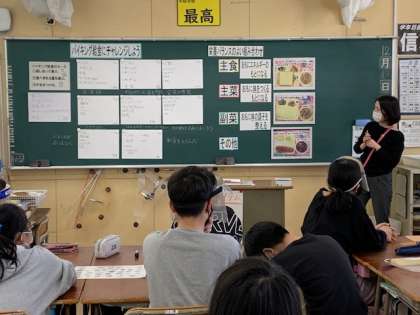 12月13日(月)5時間目、6年1組で栄養指導がありました。「バイキング給食にチャレンジしよう」という内容で、班で4つのメニューを選んでいきます。栄養バランスのよい組み合わせを学習した後で、もう一度自分たちが選んだメニューを確かめていきます。「主菜が二つあって、副菜がない。」等の声が聞こえてきました。給食のメニューを通じて自分たちの食生活を振り返ってほしいと思いました。