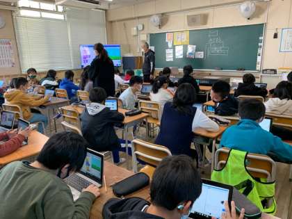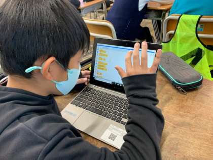 12月14日(火)3時間目、5年1組はパソコンを使ってプログラミング学習をしていました。スクラッチというアプリを使ってコマンド(命令)を組み合わせて絵を動かしたりしています。この後、プログラミングで多角形を作図するとききましたが、うまくできたのでしょうか。