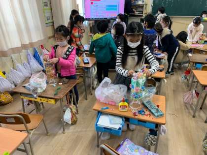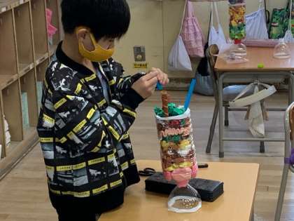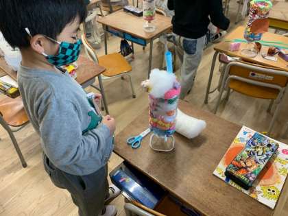 12月15日(水)1時間目、1年1組は図工で「おしゃれなパフェ」を作っていました。紙粘土に色を混ぜて入れるものを作ったり、綿や飾りを上手に使っておいしそうなパフェができてきました。