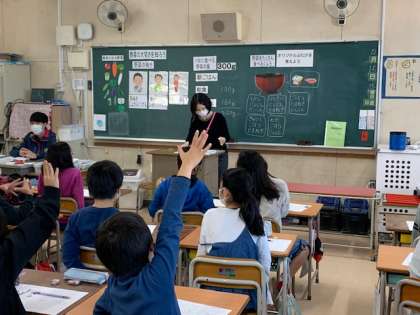 12月15日(水)1時間目、4年2組は栄養指導で野菜の大切さについて学習していました。野菜の働きとして「皮膚を丈夫にする」「風邪をひきにくくする」「便秘を防ぐ」を学習した後、野菜をたくさん食べるためにオリジナルぶた汁を考えていました。オーソドックスなもの以外にきゅうりを入れるや枝豆を入れる等の意見も出てきました。