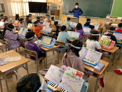 12月16日(木)2時間目、1年2組から鍵盤ハーモニカでラーメン屋さんの音が流れてきたので、ふざけているのか楽しんでいるのかなと思ってのぞきますと、鍵盤ハーモニカの練習本に「チャルメラ」が載っていておどろきました。その後「かっこう」の練習をしていました。