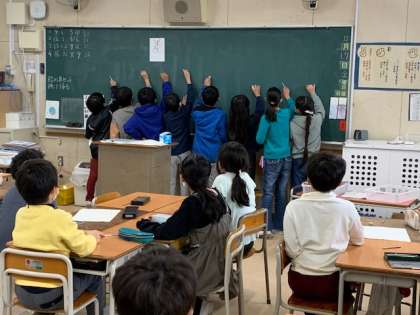 12月17日(金)1時間目、4年2組は漢字クイズをしていました。途中から班対抗で「差」の書き順チャレンジが始まりました。黒板に書いている漢字の書き順に間違いがないかをみんなでしっかり見ていました。