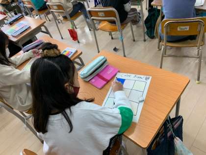 12月20日(月)2時間目、2年1組はホワイト先生と外国語活動をしていました。色を英語でどのように言うか教えていただいた後、カラービンゴをしていました。楽しそうにしていました。