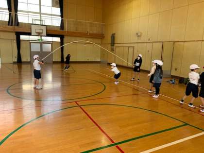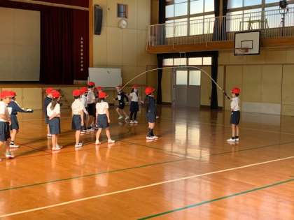 12月20日(月)2時間目、1年2組は体育で長なわ跳びをしていました。長なわ跳びは回し手がポイントで、上手に跳ぶことができたでしょうか。