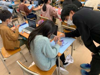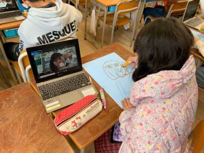 12月21日(火)4時間目、4年2組は図工で自画像を使った版画の下絵を描いていました。パソコンを使って自分の写真を撮って、それを使っていました。