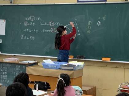 1月13日(木)3時間目、3年1組は算数で二等辺三角形の辺の長さが等しいことをコンパスを使ってどのようにしたら確かめることができるかを考えていました。「早く、簡単に、正確に」する方法を話し合っていました。