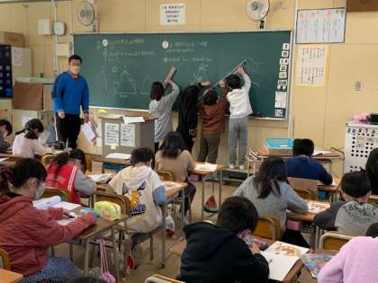 1月14日(金)3時間目、3年2組は算数でコンパスを使って正三角形をかく方法を考えていました。