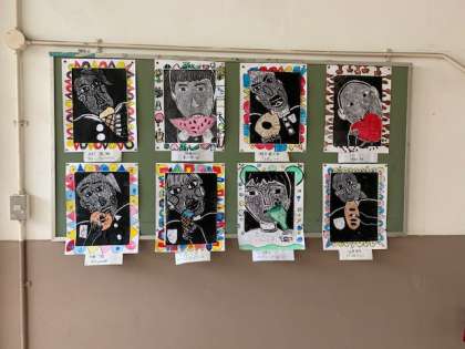 2月15日(火)4年の掲示板に版画の作品が貼ってありました。自分の顔ですが、おやつを食べている顔にしています。おやつと版画の周りを額のようにして色をつけて、とてもいい雰囲気の作品に仕上がっています。