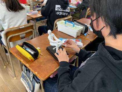 2月18日(金)1時間目、6年1組は図工で芯材にパルプ粘土をつけて動きのある人を作っていました。