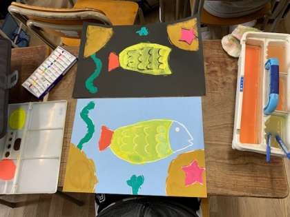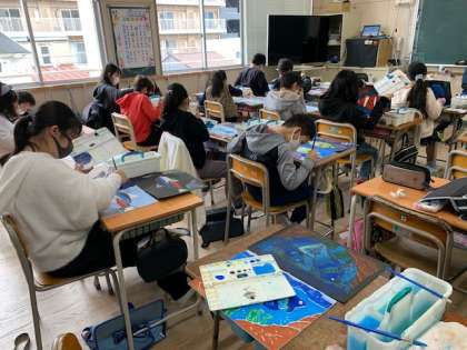 2月18日(金)1時間目、5年2組は図工で一版多色刷りをしていました。黒い画用紙に様々な色がのっていくと、いい感じになってきました。できあがりが楽しみです。