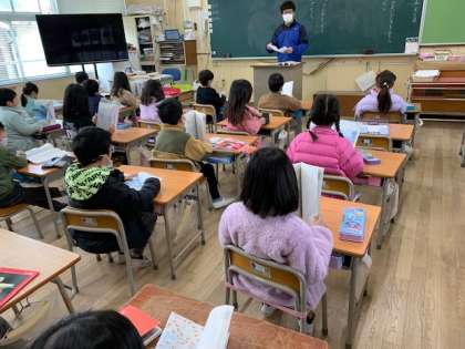 2月19日(土)1時間目、1年2組は国語で「スイミー」を音読した後、スイミーを読んでいいなと思ったところを書いていました。