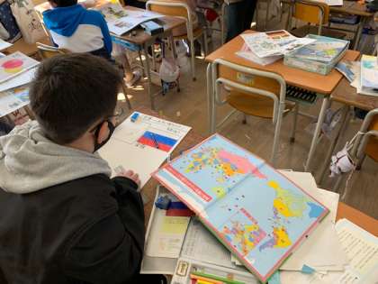 2月21日(月)2時間目、3年2組は国語で外国のことを調べてポスターにまとめていました。