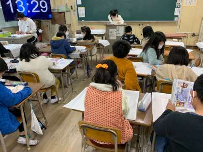 3月1日(火)3時間目、3年2組は作品袋を作っていました。早くできた子は本を読んでいました。