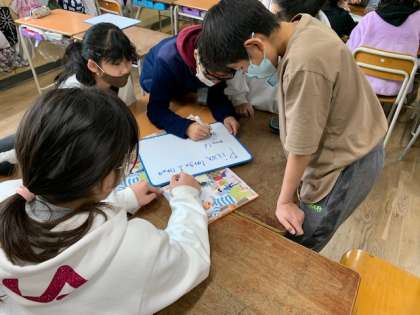 3月1日(火)3時間目、5年1組は外国語科でゲームをしていました。ホワイト先生がグループの中の一人に単語を見せます。その言葉のスペルを覚えなければなりません。後で覚えた単語を書き出して、文章を作ります。結構難しい内容ですが、子どもたちは楽しんでいました。
