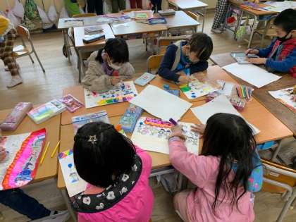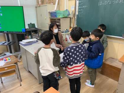 3月2日(水)1時間目、1年1組は生活科で新しい1年生に学校を紹介する練習をしていました。絵をかいている班もあれば、発表の練習をsづる班もありました。先生に聞いてもらっている班もありました。