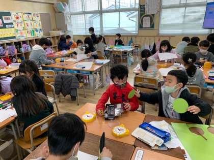 3月2日(水)1時間目、1年2組は生活科で新しい1年生にメダルを作っていました。自分たちが昨年、2年生にメダルをもらったので作ろうと決まったようです。算数セットの時計を使って円を作っていました。