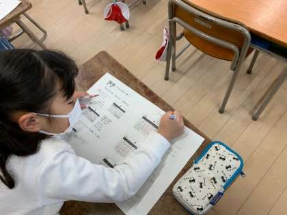 3月9日(水)1時間目、2年2組は算数で、カレンダーを使って式を作っていました。