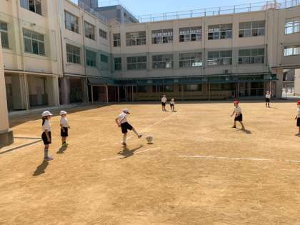 3月10日(木)3時間目、1年生は春の日差しを浴びながら体育でキックベースボールをしていました。