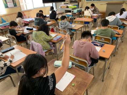 3月16日(水)4時間目、1年2組は書写で、鉛筆で丁寧に字の練習をしていました。