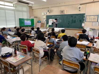 3月17日(木)1時間目、4年2組は図工で、「書道アートを楽しもう」に取り組んでいました。作品袋に文字を書くようです。黒板には、1文字。やりすぎ注意。書かれていました。