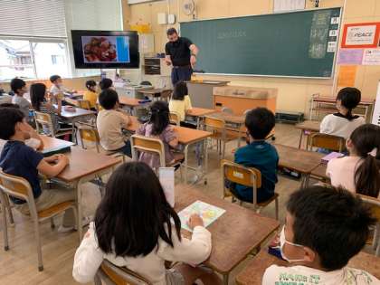 4月14日(木)3時間目、3年2組は外国語活動で、新しいC−NETの先生の自己紹介を聞いていました。楽しく聞いていました。