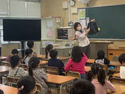 4月15日(金)朝の会の時間に、1年1組は交通安全ワッペンについて、先生の説明を聞いていました。