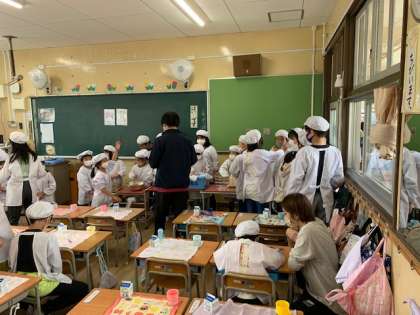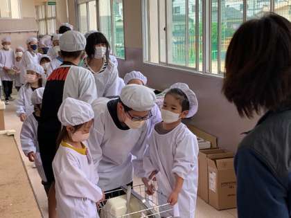 4月18日(月)1年生の給食は、1年生が給食当番をしていました。運ぶとき、6年生が腰をかがめて1年生の高さに合わせてあげていました。配膳時も、6年生が後ろから見守って、できないところを手助けしていました。
