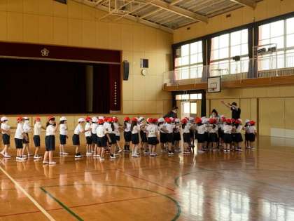 4月19日(火)2時間目、1年は体育で並び方の練習をしていました。速く並べるようになると、体育でいっぱい体を動かせるだけでなく、遠足等の校外活動でも安全に移動できますね。
