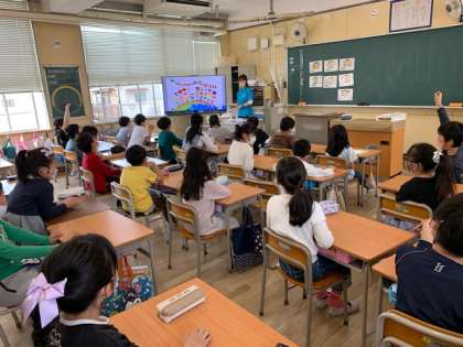 4月20日(水)1時間目、3年1組は外国語活動で、いろいろな国の国旗やあいさつについて学習していました。