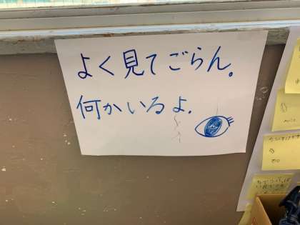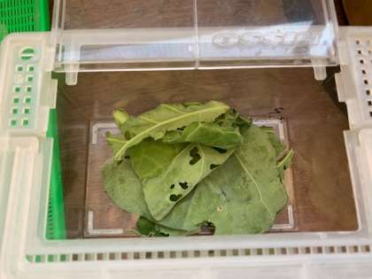 5月2日(月)3年生の教室前の廊下に貼り紙と透明のケースがありました。ケースには葉っぱがあります。何がいるのでしょう?