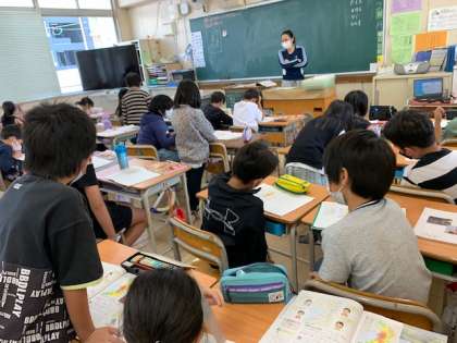 5月2日(月)4時間目、4年1組は社会科で大阪府の学習をしていました。「田尻町と千早赤阪村ではどちらの人口が多いでしょうか」という問題に対して、町と村という観点から子どもたちは考えていました。