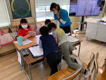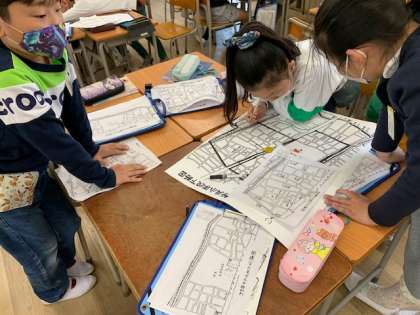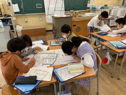 5月2日(月)4時間目、3年1組は、2・3時間目に町たんけんをしたことを白地図にまとめていました。「おいしいパン屋さんがあった。」や「コンビニの場所はどこだろう。」等話し合いながら、見てきたことをまとめていました。ゴールデンウイーク中にも町で、おもしろいものを見つけたら教えてほしいですね。