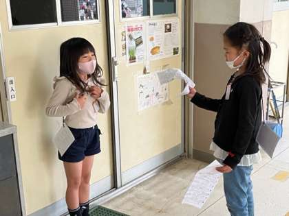5月9日(月)休み時間に2年生の子が1年生2を学校たんけんで案内した時に説明するのを練習していました。1年生に伝わるように頑張って練習していました。