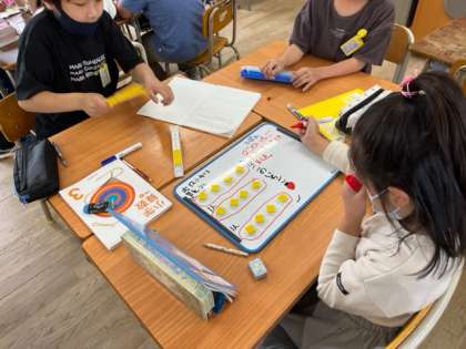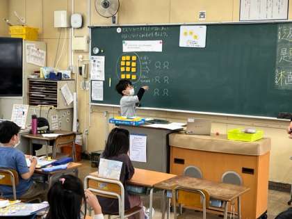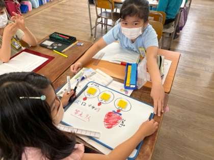 5月11日(水)1時間目、3年2組は算数でどんな分け方をしたかを班で話し合い、班ごとに発表していました。話し合いをしっかりし、ホワイトボードに書き表していました。また班の代表が上手に発表していました。