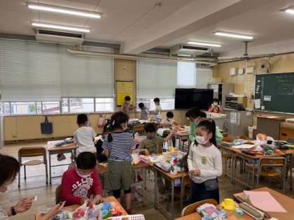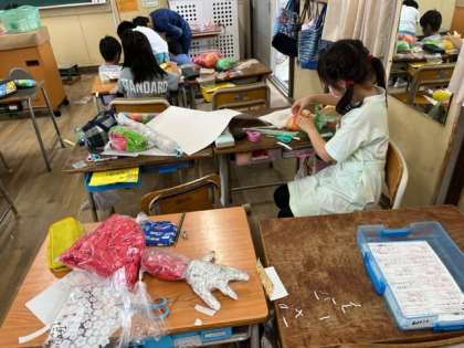 5月13日(金)2時間目、3年はシュレッダーで刻まれた紙を使ってぬいぐるみのようなものを作っていました。上手に形を組み合わせてかわいいものができていました。