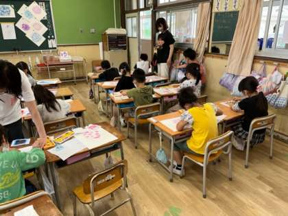 5月13日(金)3時間目、1年2組は図工で「あじさいの はな」を作っていました。クレパスで濃いところや薄いところを作っていました。濃いところはグッグッと塗り、薄いところはシュッシュッと塗るようです。