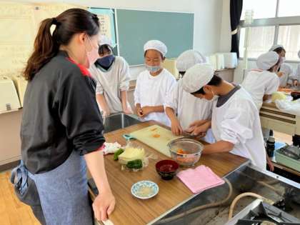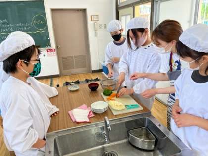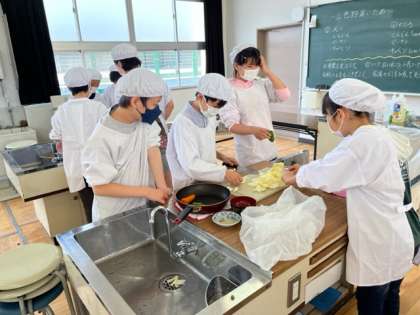 5月18日(水)1時間目、6年生は家庭科で、「三色野菜いため」の調理実習をしていました。