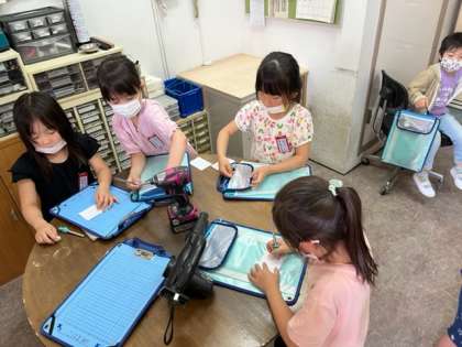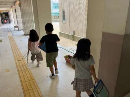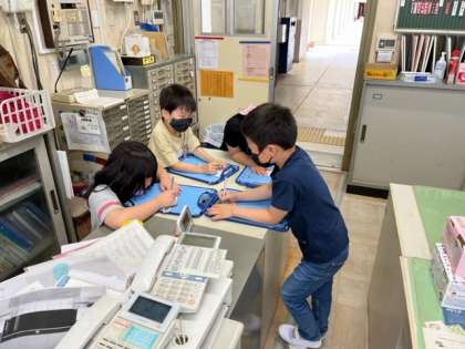 5月23日(月)3時間目、1年生は学校たんけんをしていました。管理作業員室では、いろいろな道具を見せてもらっていました。