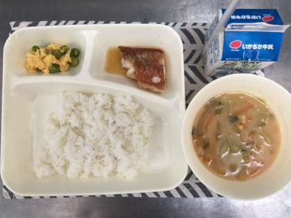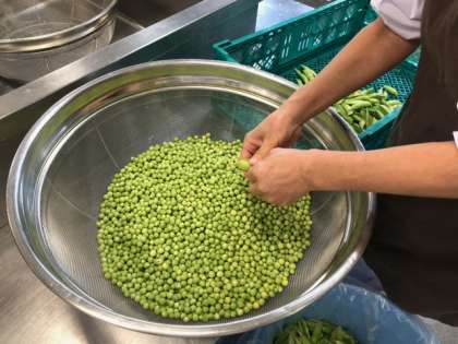 えんどうがたくさんとれておいしいのは、春から夏の初めにかけてです。今日は朝から調理員さんが、えんどうを一つ一つさやから取り出して調理してくださりました。