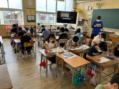 5月27日(金)4時間目、3年2組は国語のテストをしていました。先生が読んだ文をよく聞いてメモし答えを書いているところでした。
