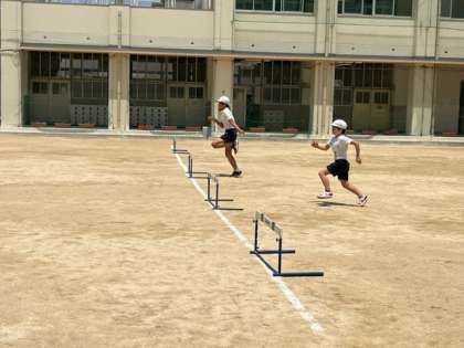 5月27日(金)4時間目、6年2組は体育でハードル走をしていました。