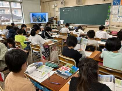 5月31日(火)1時間目、5年1組は社会科で低地に住む岐阜県海津市の人々のくらしについて調べていました。