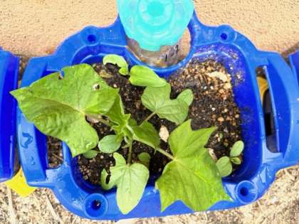 6月1日(水)4時間目、1年2組は生活科でアサガオの観察をしていました。双葉が出て本場が出始めています。